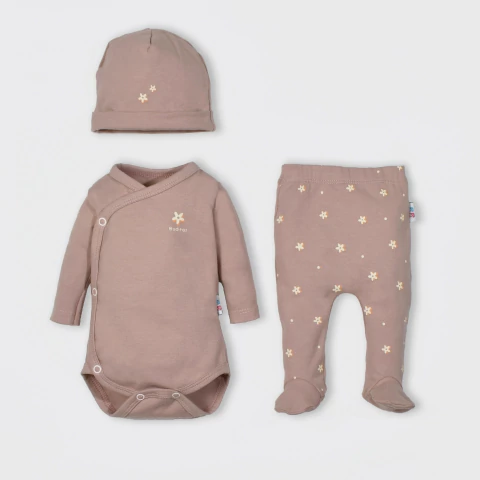 Ajuar de 3 piezas de 100% algodón super suavecito, color rosa hermoso estampado con pequeñas y delicadas Florcitas. Cuenta con un body cruzado, ideal para los primeros meses de tu Budita. Ideal para armar el bolso de la clínica y el primer tiempo del bebé. Además de una ranita con piecito tambien estampada y un gorrito a juego.Contiene lo que necesitas para llevar al nacimiento de tu bebé.